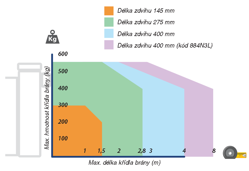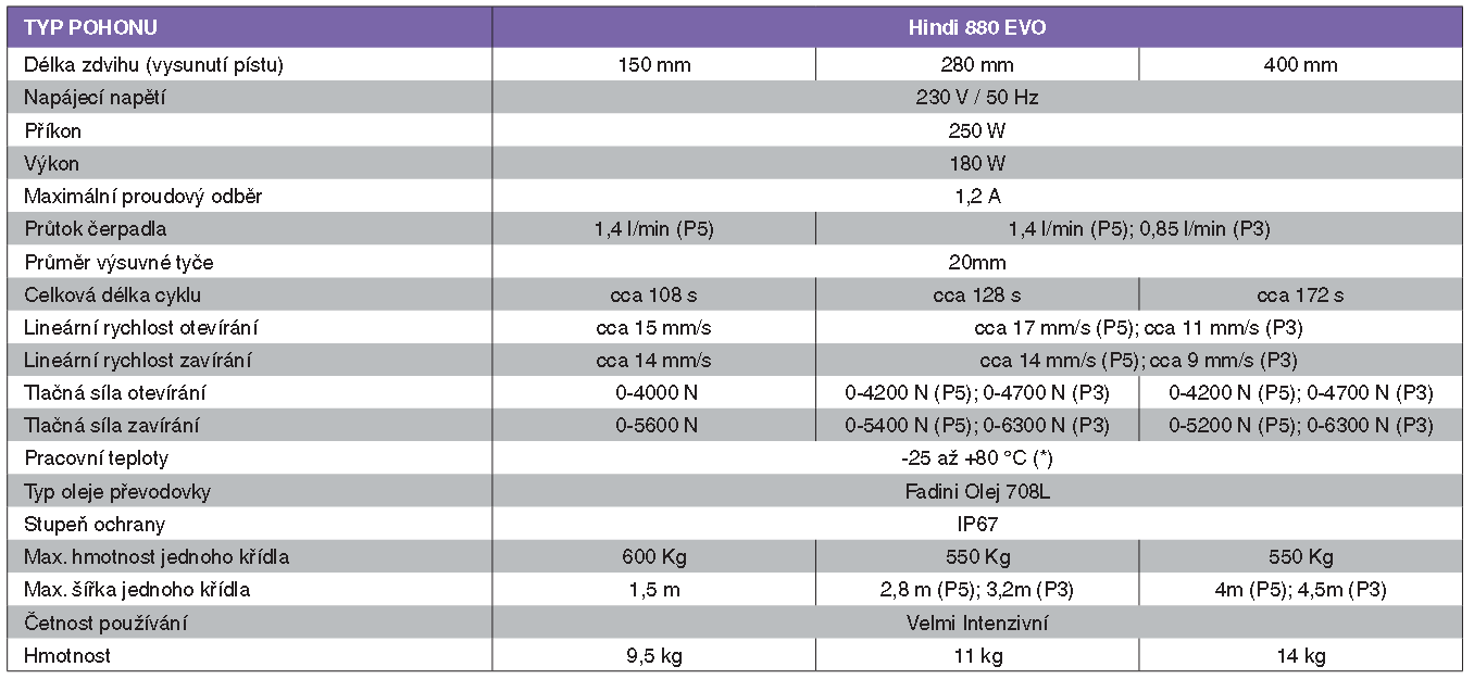 Hydraulický pohon HINDI 880 bez blokování se stavitelným zpomalením při otevření/zavření doplněný příchytkami pro svařování, přívodním kabelem, 2 klíči k zámku chránících regulační ventily. Pro křídlo do 8 m nebo 550 kg, čas otevření cca 45s + čas zpomalení.