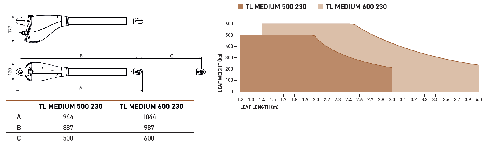 Motor 230V řady TL (dříve CALYPSO) pro křídlo brány do 4 m. Univerzální provedení, tj. nerozlišuje se pravý / levý.
