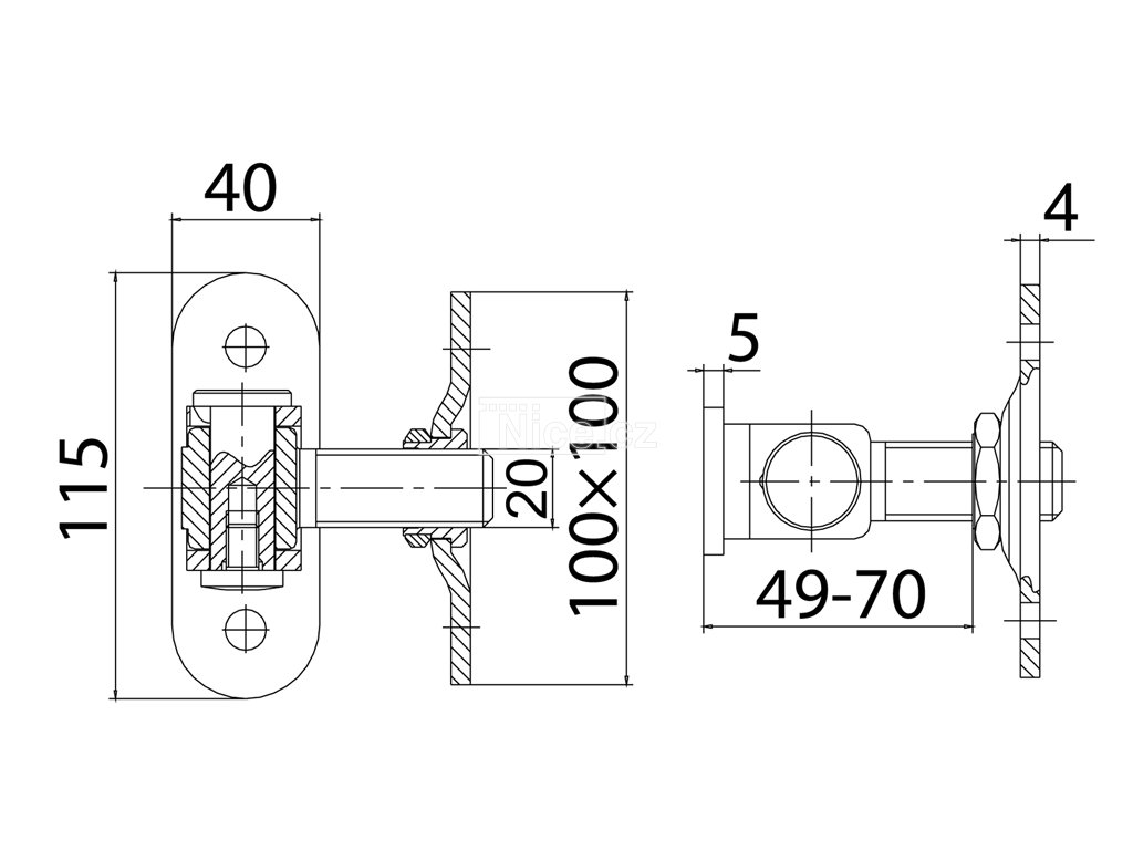 Závěsný nastavitelný nerezový pant pro křídlové brány se závitem M20 s deskou pro přišroubování 100 × 100 mm na sloupek a konzolou pro přišroubování (115 x 40 mm) ke křídlu brány. Snadné seřízení pantu pomocí otočné matice. Pant je možné nastavovat se zavěšeným křídlem - v případě přitahování je vhodné přizvednutím křídla závit odlehčit. Po namontování nevzniká zbytečný prostor mezi brankou a sloupkem díky ploché konstrukci pantu.