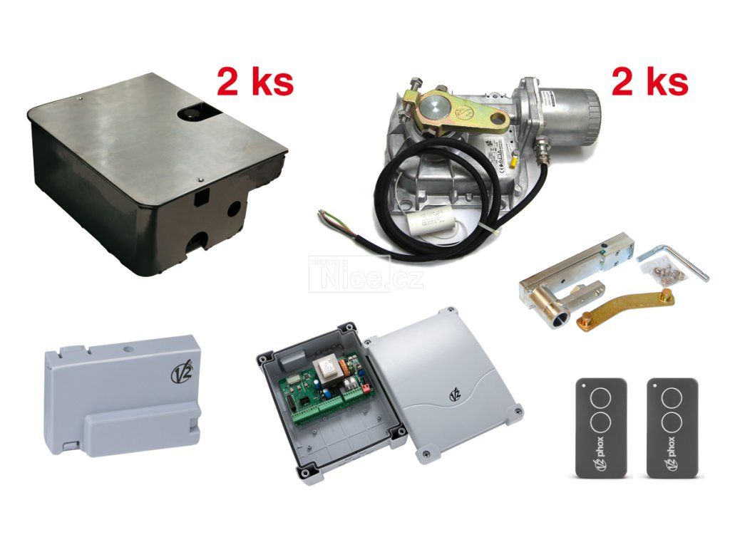 Sada podzemních pohonů s napájením 230V pro dvoukřídlé brány o celkové šířce 2x3.5 m a hmotnosti 2x800 kg.